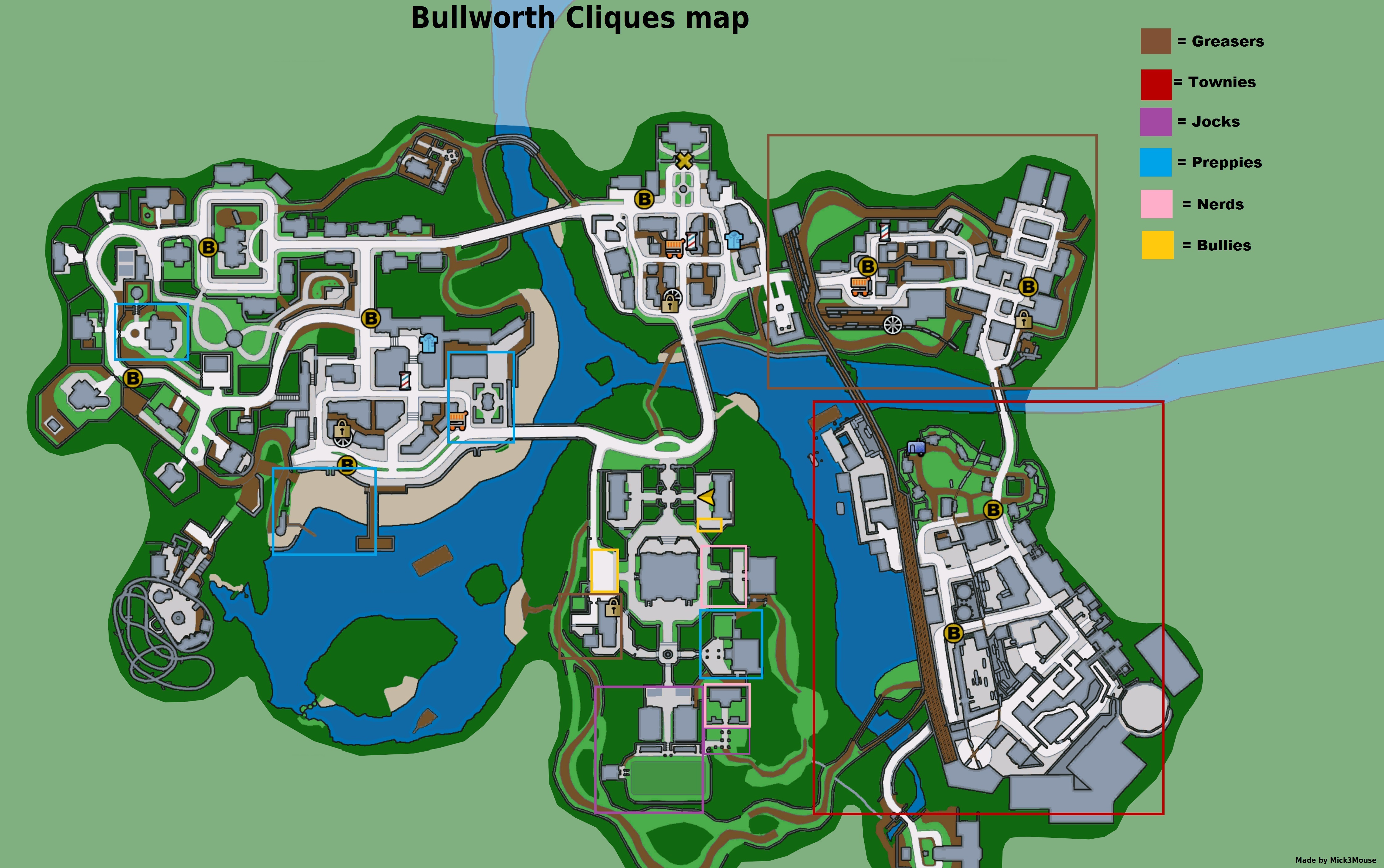 Dyro, Dr. Crabblesnitch mówi nam wprost, abyśmy nie wpadli w żadne kłopoty bo inaczej szybko sprowadzi nas na ziemię. Po tej jak pocieszającej rozmowie poznajemy naszych nowych kumpli: Gary Smith oraz świeżak Peter "Pete/Petey" Kowalski. Gary jako starszy uczeń pokazuje nam zróżnicowane grupy żyjące na uczelni Bullworth Academy oraz w mieście o tej samej nazwie. Uczniów można podzielić na 6 głównych klas: